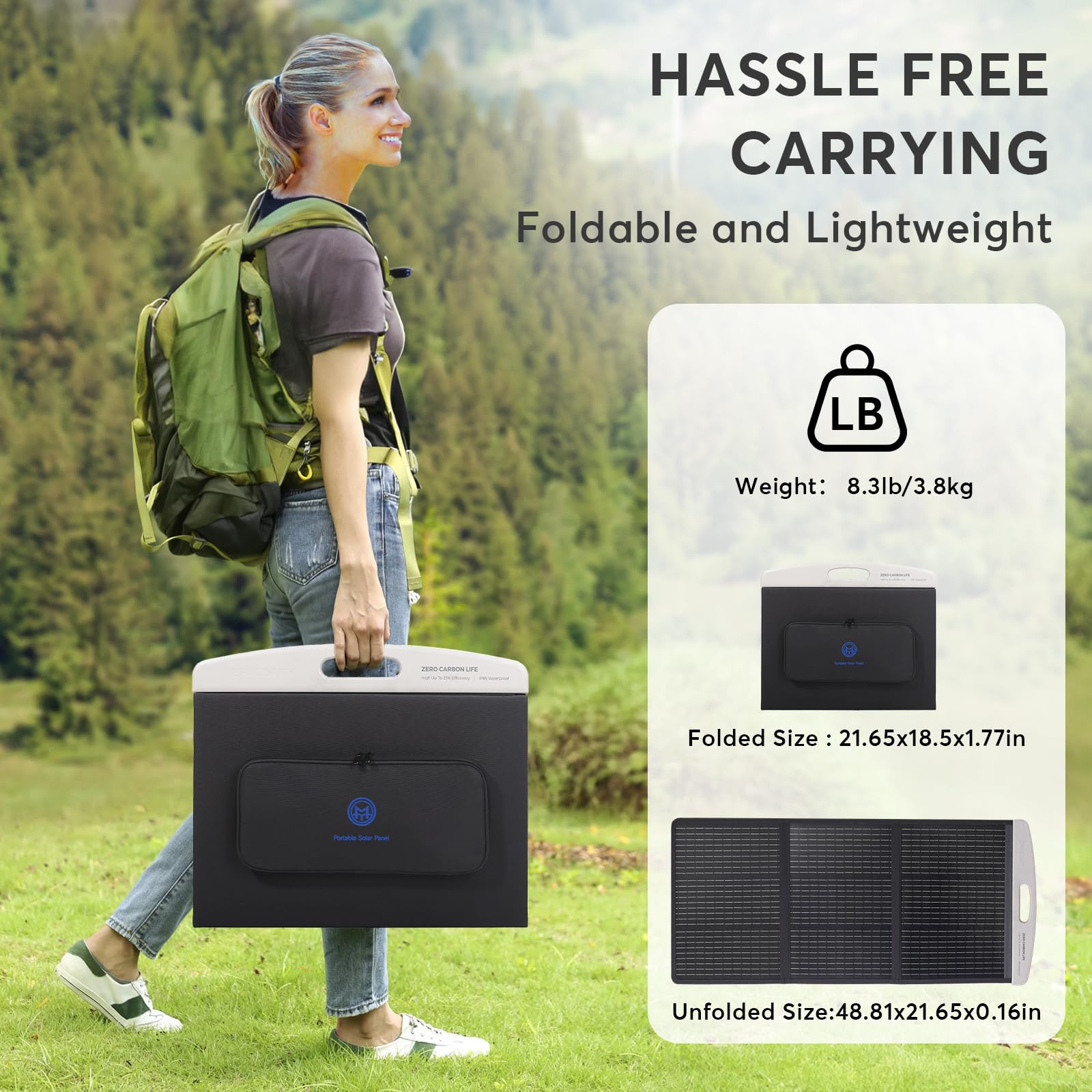 - 【PORTABLE & FOLDABLE】The solar panel charger only weights 8.3lb and folds to a compact size (21.65”x18.5”x1.77”), can be easily carried with one hand, even by women. It is equipped with 2 adjustable kickstands, which can maximize the solar power by setting the angle of the stand.The ergonomic design of TPE rubber handle makes it easier to carry . The zippered pouch is convenient storage for solar panel accessories and cell phones.