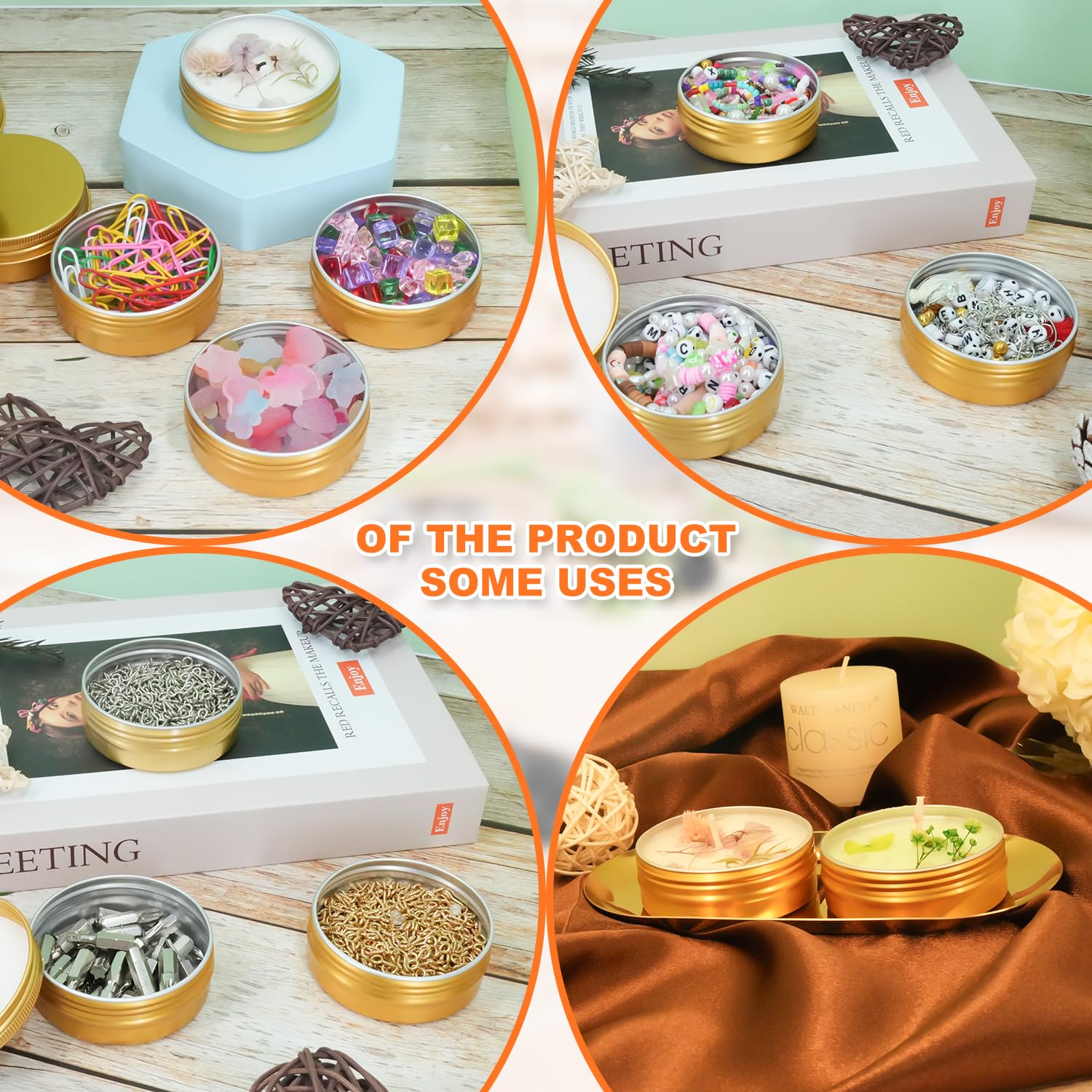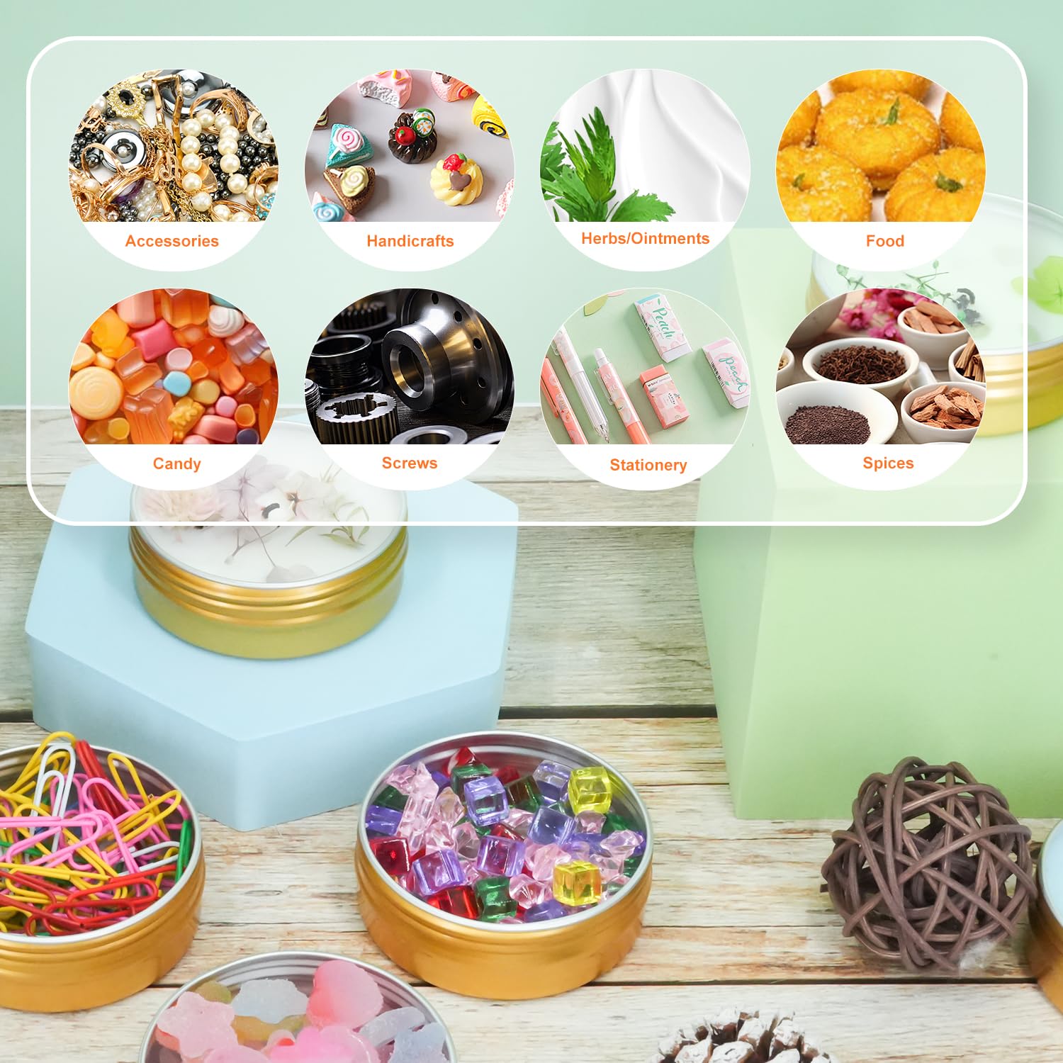 - Use our high-quality, food-grade aluminum tin containers to safely contain all of your handmade lip and body balms, hand creams and salves, essential oils, ointments, medicinal herbs and waxes, spices and seasonings, tea candles, powders, loose leaf teas, glitter, potpourri, bath salts (not the bad kind), earrings and other small jewelr.