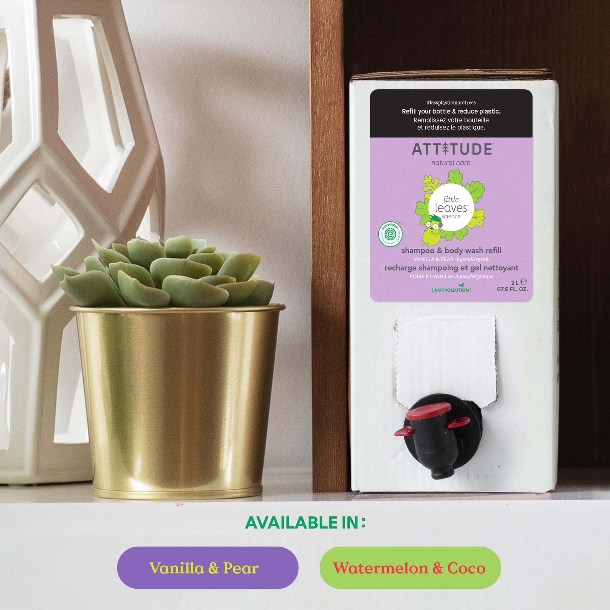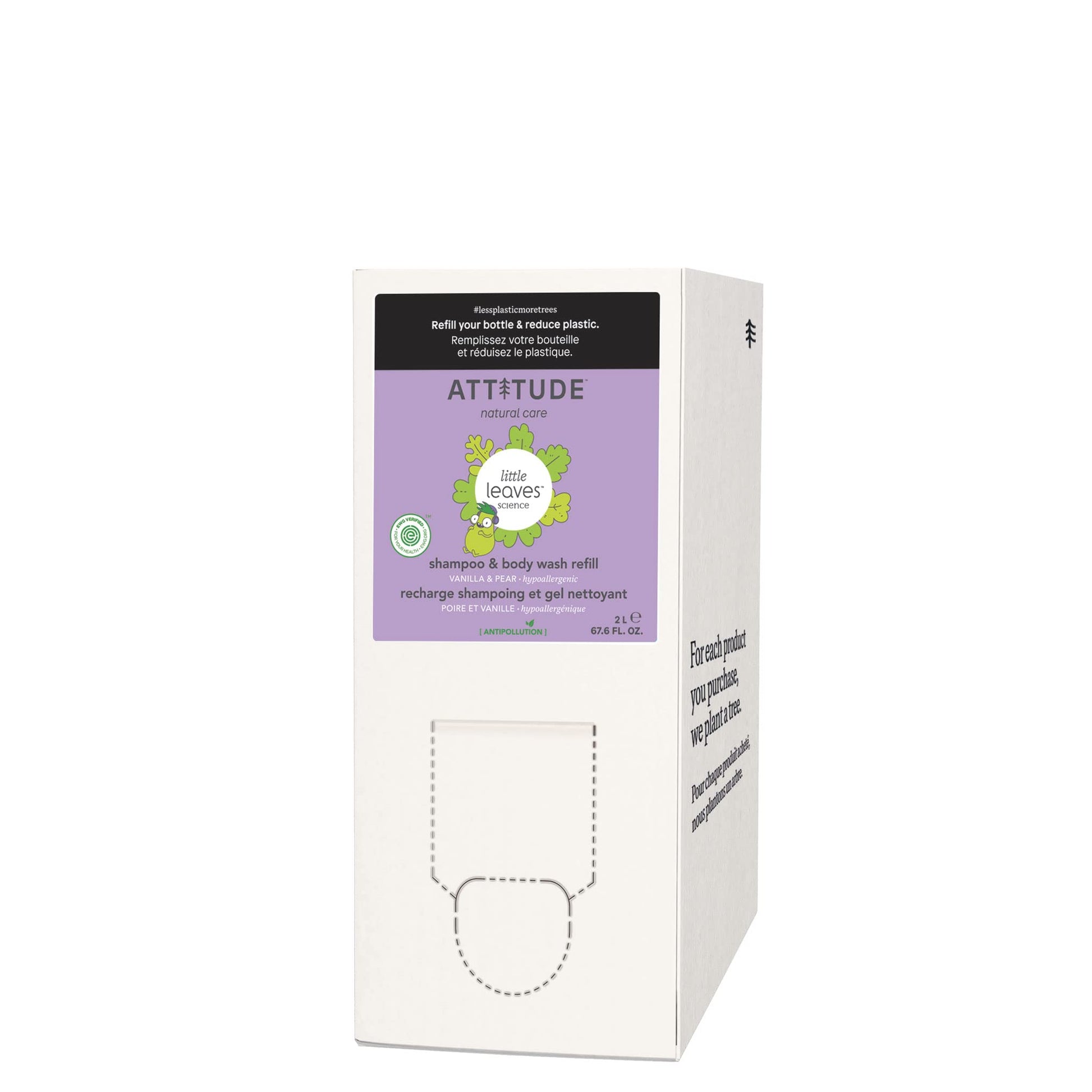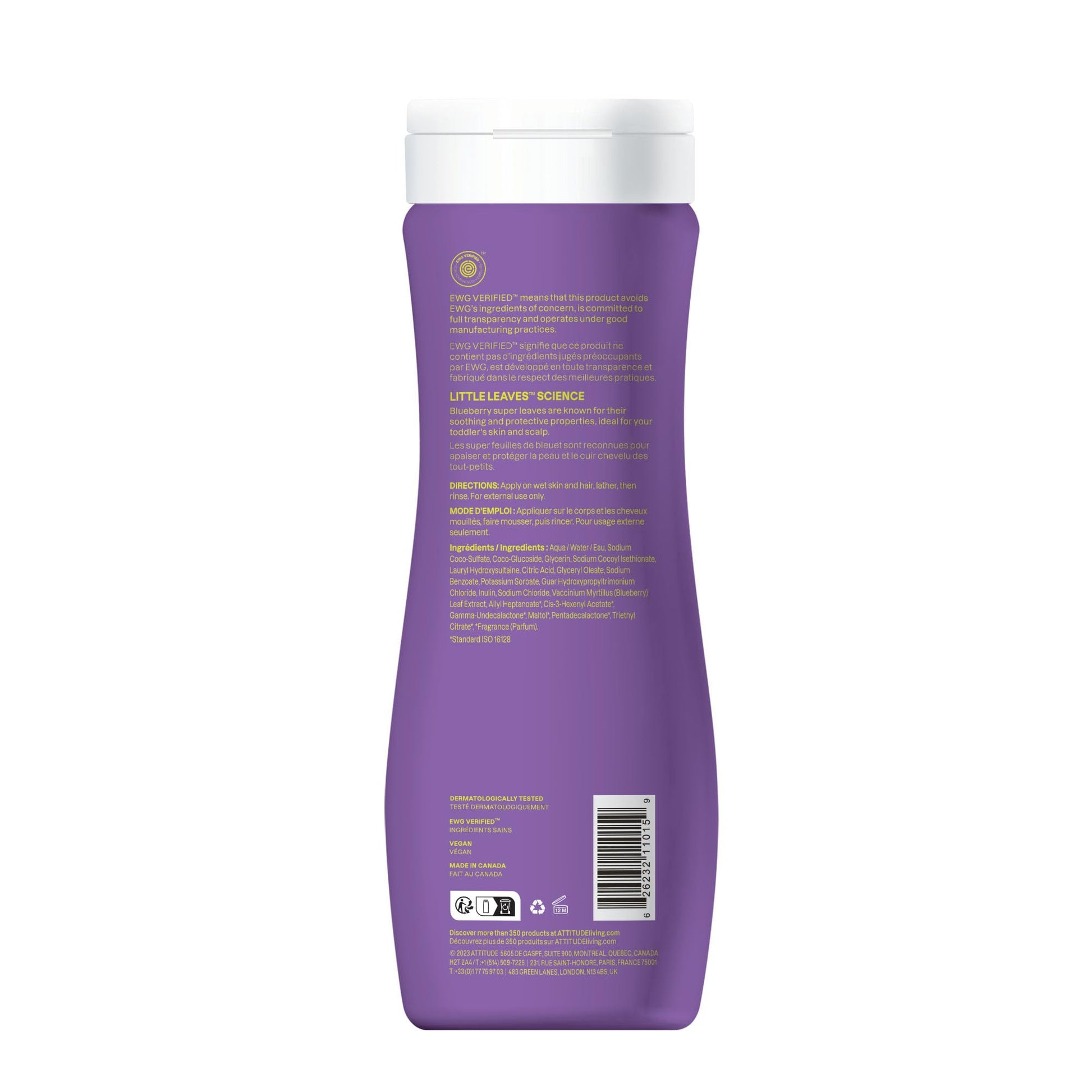 Make bath time fun and foamy with ATTITUDE Little leaves 2-in-1 hair Shampoo and Body Wash - Vanilla and Pear. Our gentle, natural cleansing formula is perfect for your little one's delicate skin and scalp. EWG VERIFIED and PETA Certified (vegan and cruelty-free --Never Tested on Animals), our hair and body wash is made with plant- and mineral-based ingredients from natural sources like soothing blueberry leaf extract and detoxifying moringa seed extract. Clean your child's hair and body in one single step, leaving more time to play!