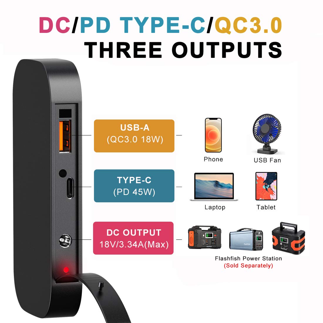 - [ 3 Outputs ]: The solar panel features with 1*USB-C(45W), 1*USB-A(18W) port and 1*DC Output.Charging multiple devices at the same time, such as smartphones and tablets, GPS, digital cameras, etc. Ideally suited for outdoor life and even unexpected power outages.