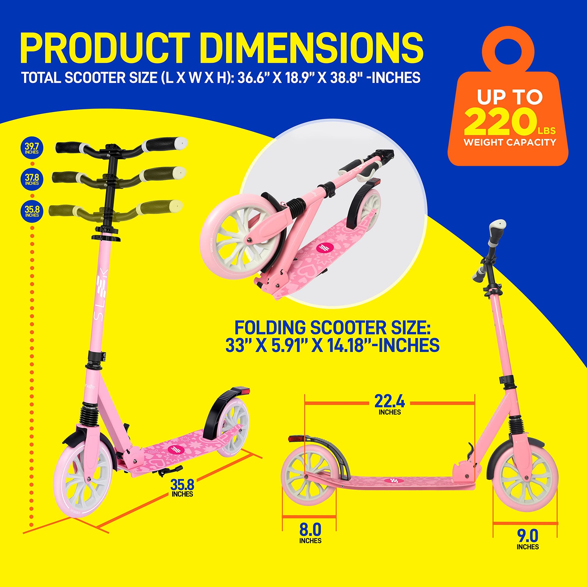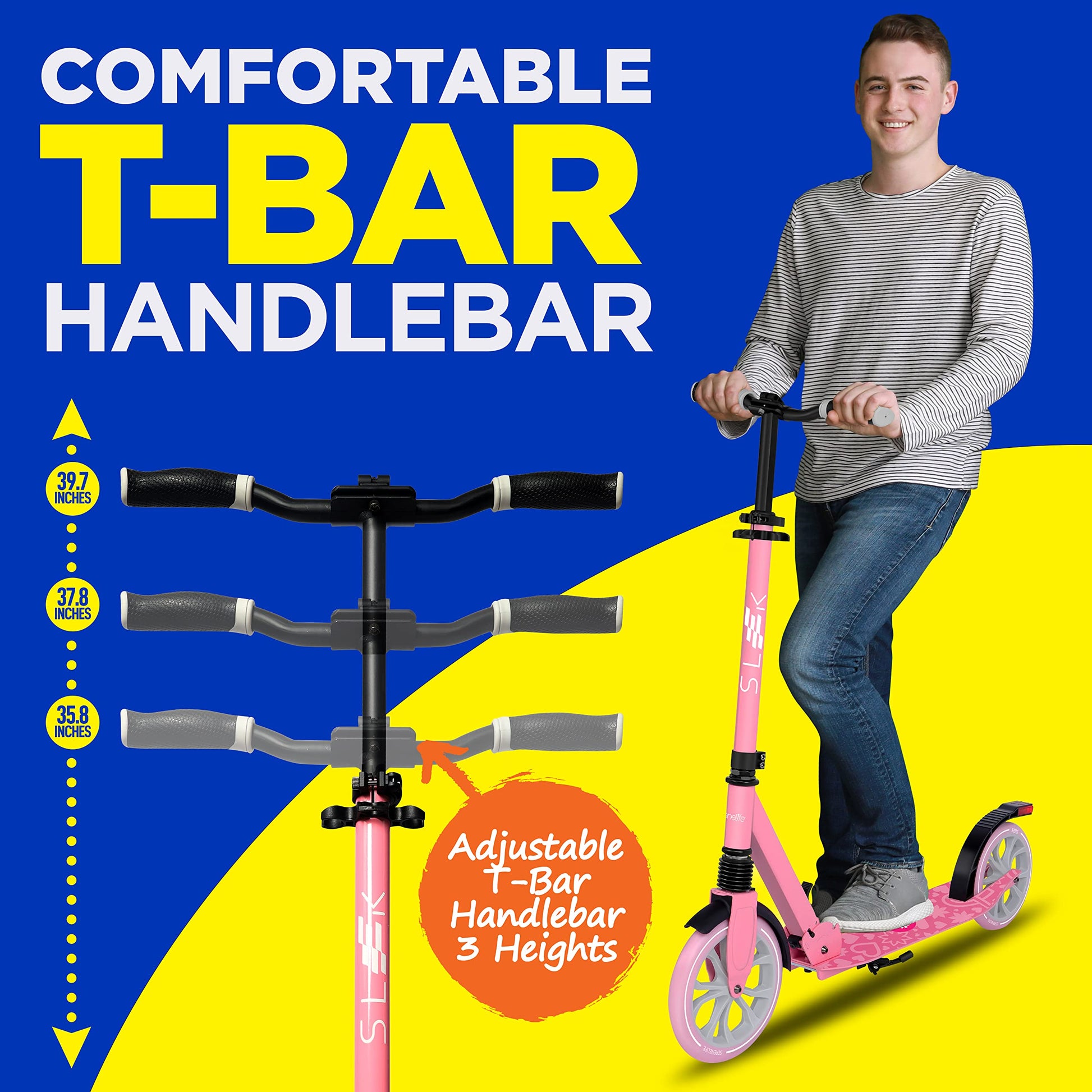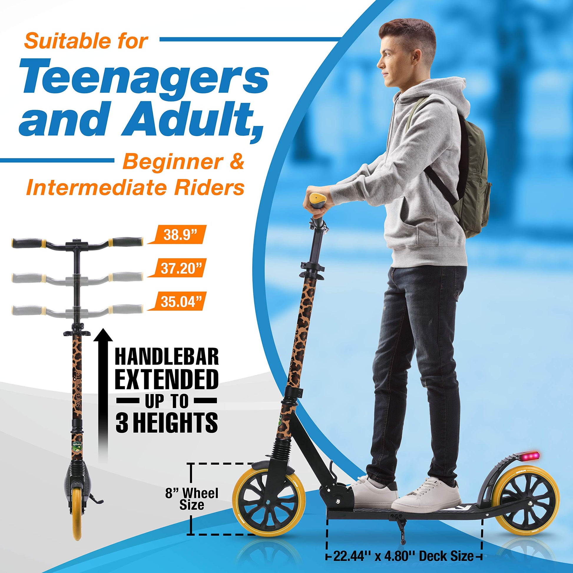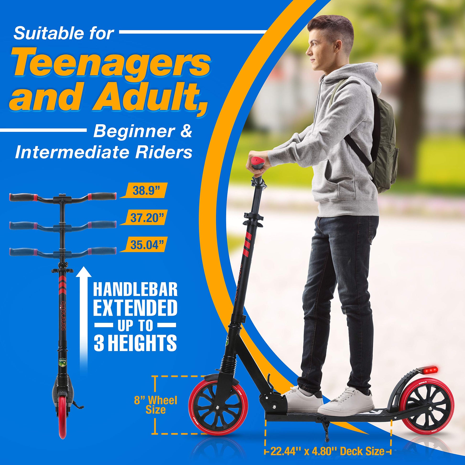 - ADJUSTABLE HEIGHT: Our compact teen scooter boasts a T-bar handlebar adjustable to three heights: 33.8", 35.4", and 37.8". It's equipped with a durable anodized clamp collar for added strength