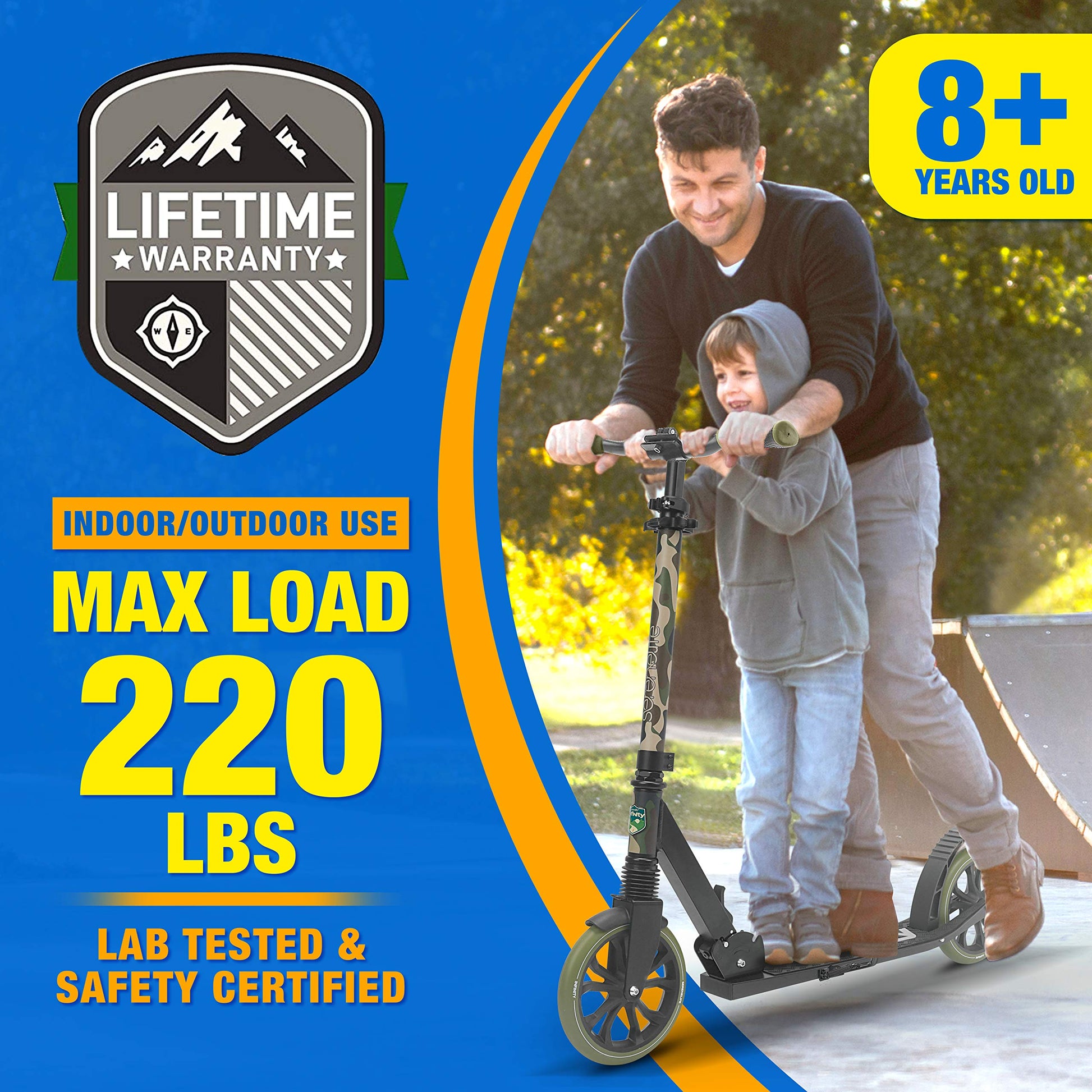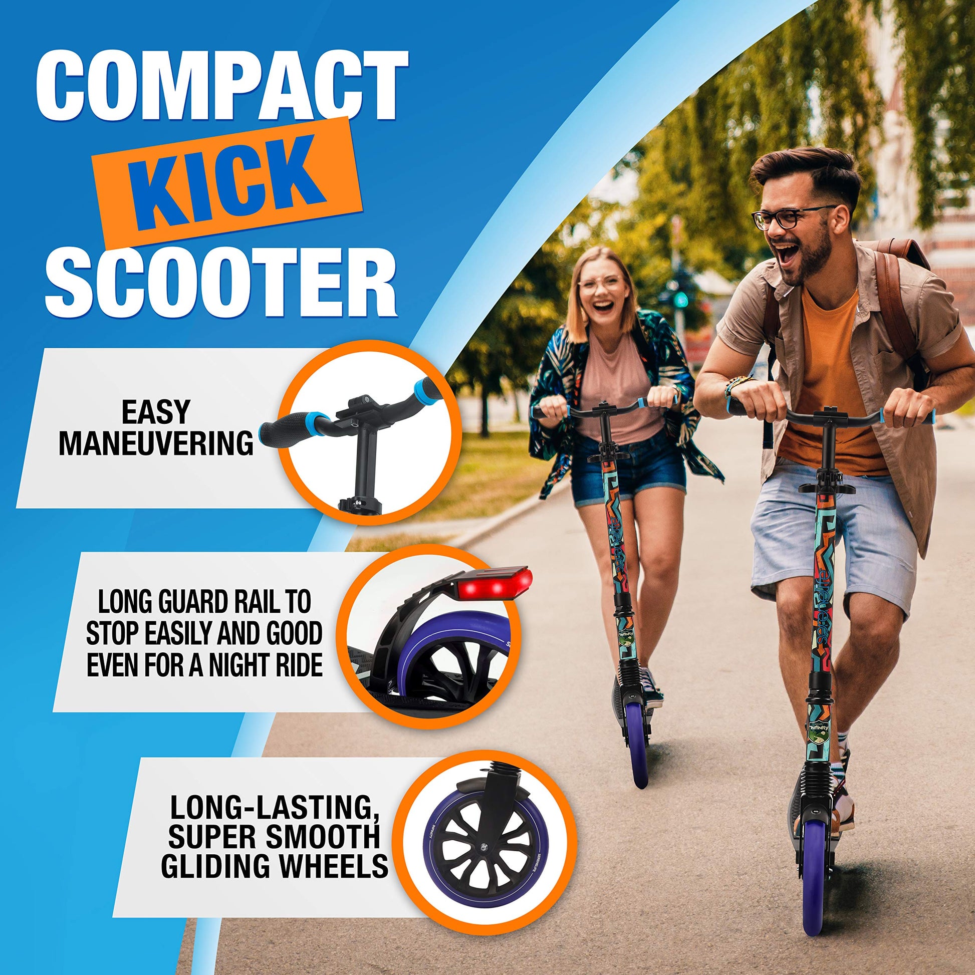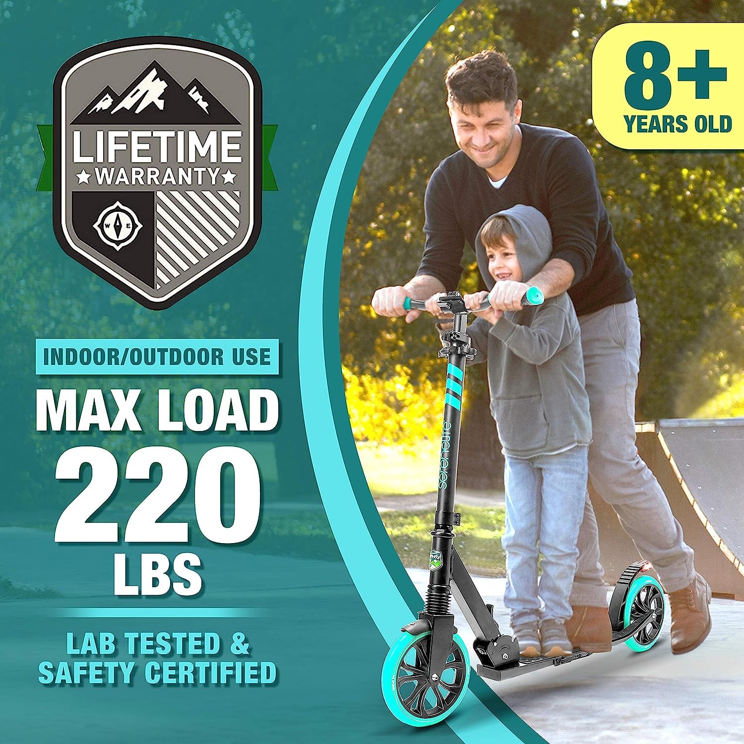 - LIGHTWEIGHT ALLOY DECK: The Kick Scooter for kids and adults features a durable alloy deck, perfect for indoor and outdoor use, with an extended standing area for improved performance. Supporting riders up to 220 LB, it's suitable for ages 7 and up