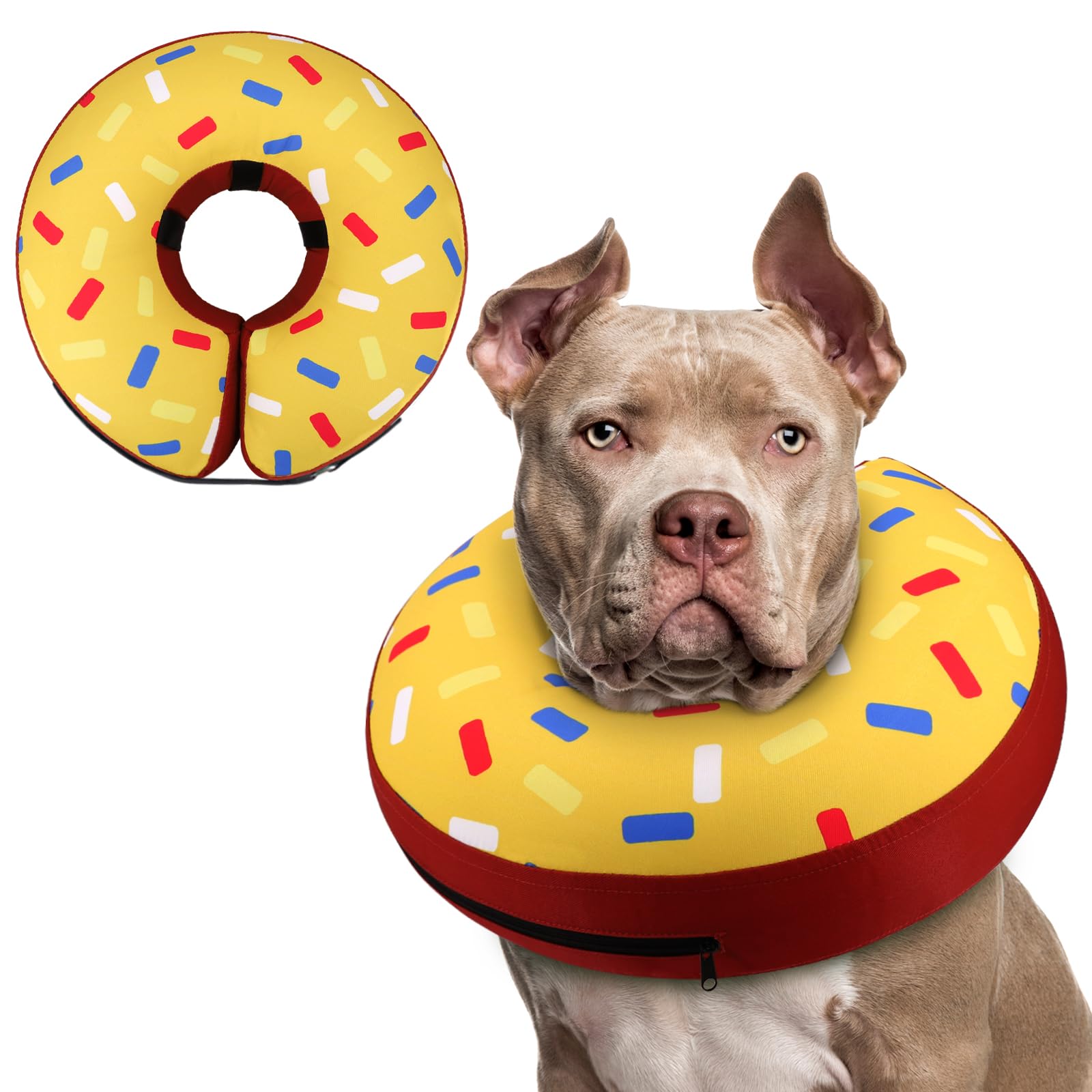 - SCRATCH & BITE RESISTANT - This inflatable dog donut collar is a perfect cone for dogs after surgery. Inflated dog neck donut works like a plump barrier around your canine's neck, can effectively prevent your pets from biting and licking injured area or surgical site. With this collar on, the unique and cute donut shape makes it like a pet ornament instead of a dog surgery collar, your pet must be a million times happier with this.